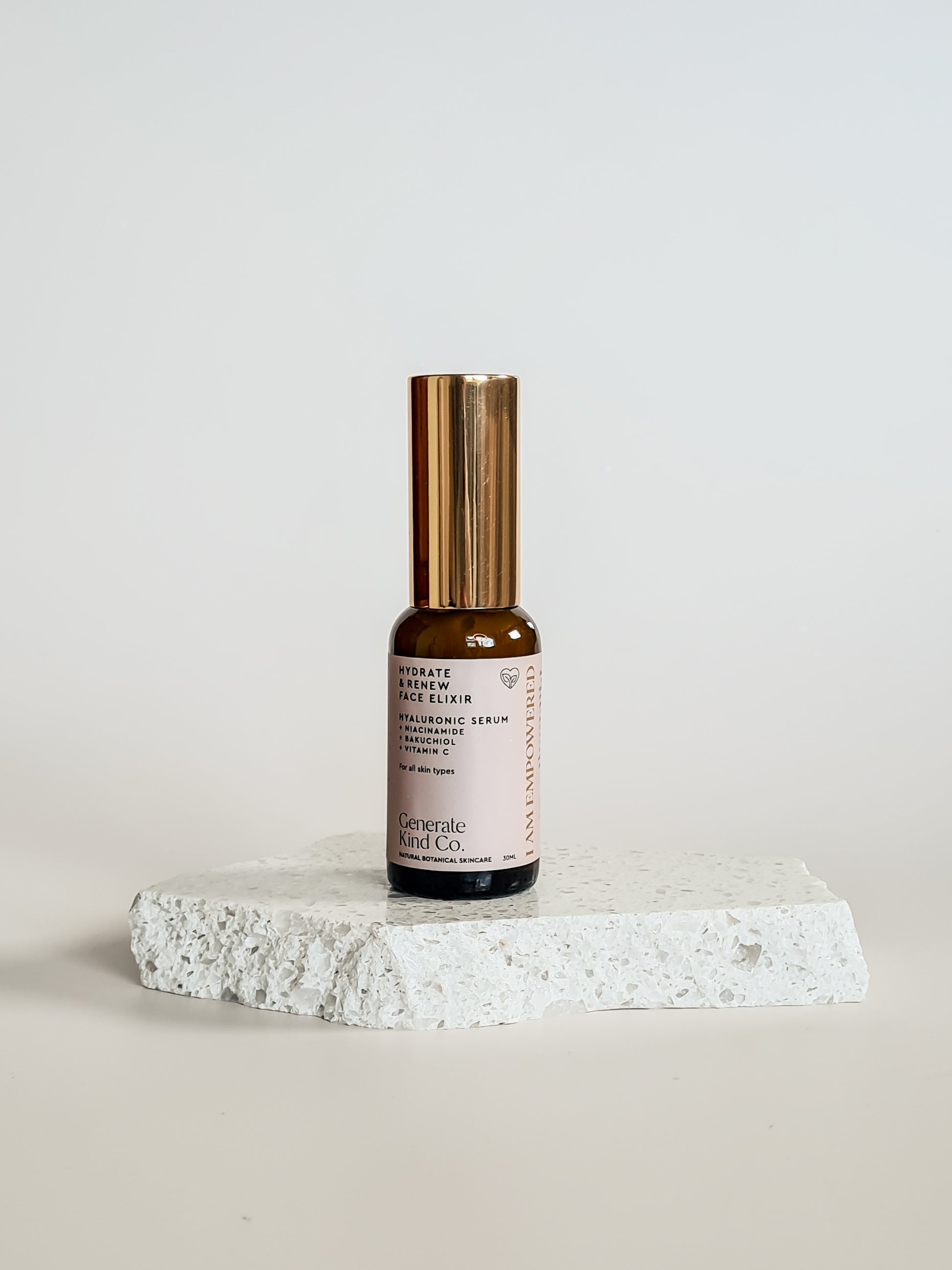 Our Face Elixir Hyaluronic Serum deeply hydrates, brightens and restores your skin’s natural radiance. With high and low molecular weight Hyaluronic Acid, it replenishes moisture at multiple levels and strengthens the skin barrier. Bakuchiol supports collagen, softens fine lines and improves texture, while Kakadu Plum delivers antioxidants for firmness and brightness. Niacinamide refines pores and evens tone, Provitamin B5 and Allantoin soothe and plump, and Hibiscus Extract gently resurfaces for elasticity and luminosity. Balanced with Rosehip Oil and Rose Hydrosol, our Face Elixir Hyaluronic Serum leaves skin hydrated, resilient and radiant.